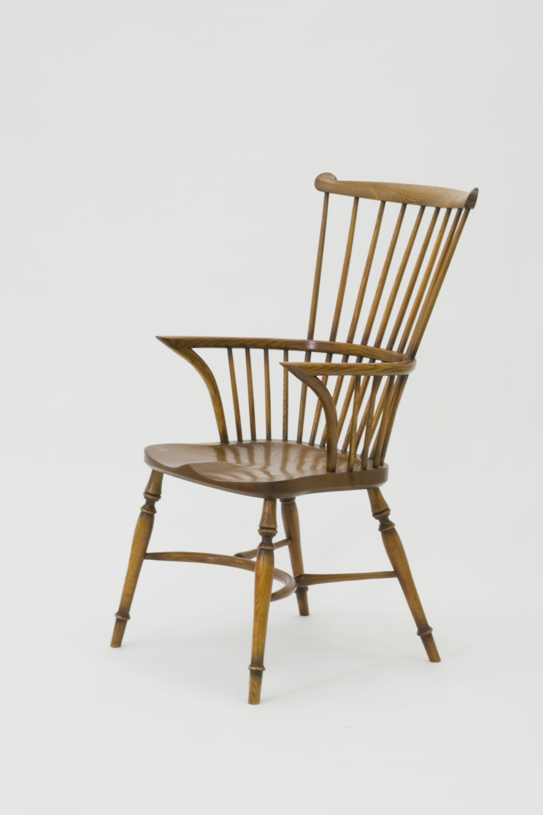 イギリスの各地で農民達の手によって実用性を重んじてつくられていた椅子が、17世紀後半頃にウィンザーチェアとしてひとつの完成の域に達した。そのなかでも最も古いタイプのひとつが、このコム(櫛)バックである。細いスポークが平行して並ぶ造形は、座り心地の良さの象徴である。またニレ材を用いた座板も座り心地の良さを求めて、波型の削りだしとなっている。なお「貫」の部分に使われているカウホーンと呼ばれる形は、ウィンザーチェアが様式家具から影響を受けた一つの典型例であろう。 |
