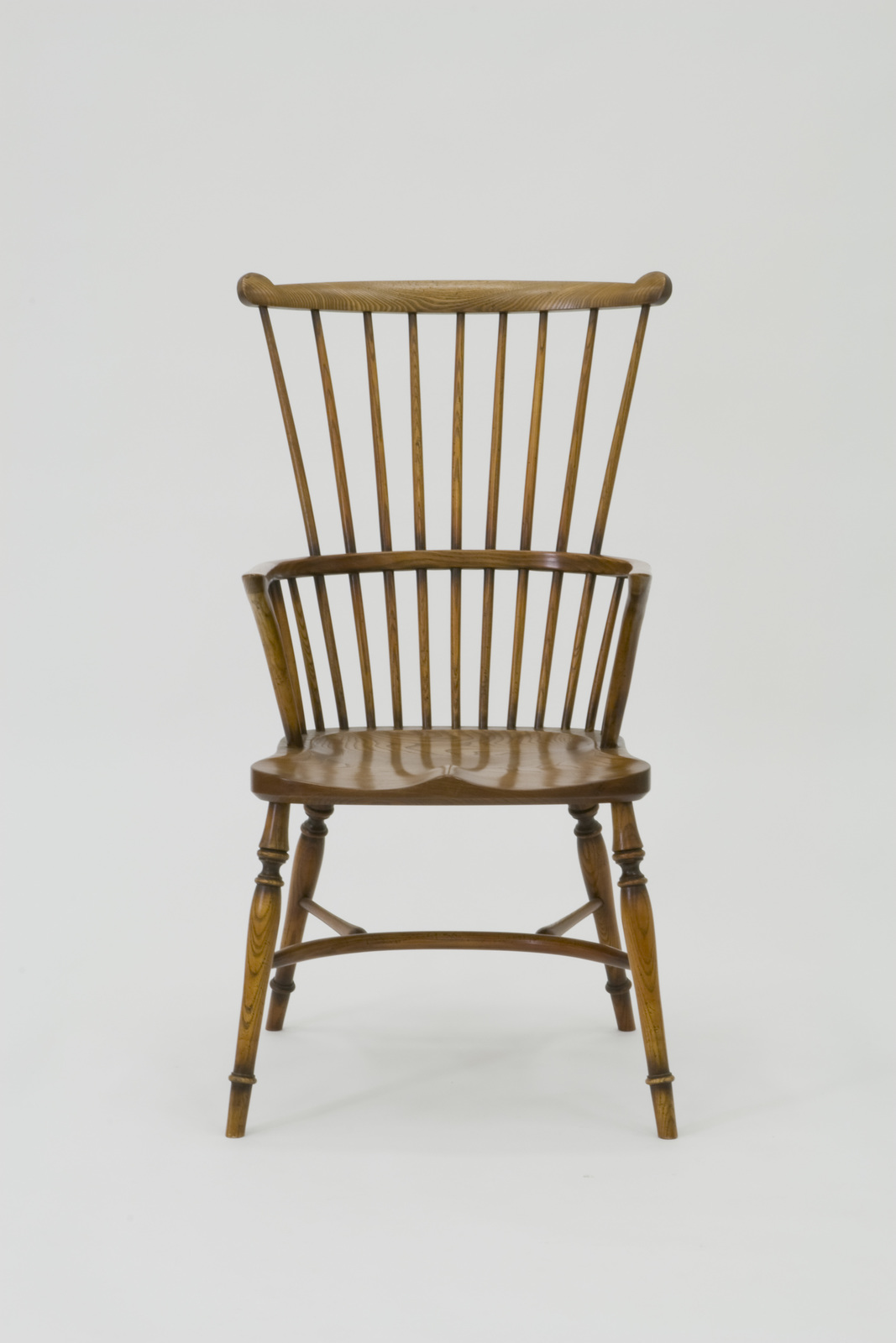 イギリスの各地で農民達の手によって実用性を重んじてつくられていた椅子が、17世紀後半頃にウィンザーチェアとしてひとつの完成の域に達した。そのなかでも最も古いタイプのひとつが、このコム(櫛)バックである。細いスポークが平行して並ぶ造形は、座り心地の良さの象徴である。またニレ材を用いた座板も座り心地の良さを求めて、波型の削りだしとなっている。なお「貫」の部分に使われているカウホーンと呼ばれる形は、ウィンザーチェアが様式家具から影響を受けた一つの典型例であろう。 |