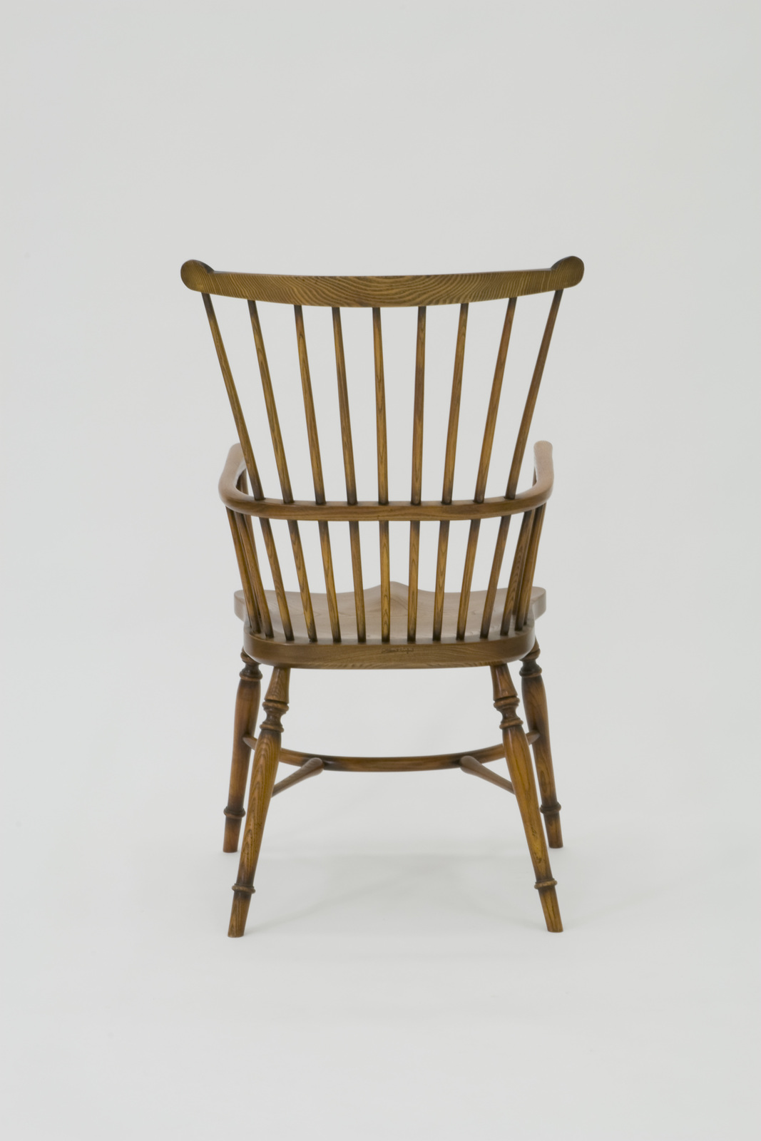イギリスの各地で農民達の手によって実用性を重んじてつくられていた椅子が、17世紀後半頃にウィンザーチェアとしてひとつの完成の域に達した。そのなかでも最も古いタイプのひとつが、このコム(櫛)バックである。細いスポークが平行して並ぶ造形は、座り心地の良さの象徴である。またニレ材を用いた座板も座り心地の良さを求めて、波型の削りだしとなっている。なお「貫」の部分に使われているカウホーンと呼ばれる形は、ウィンザーチェアが様式家具から影響を受けた一つの典型例であろう。 |