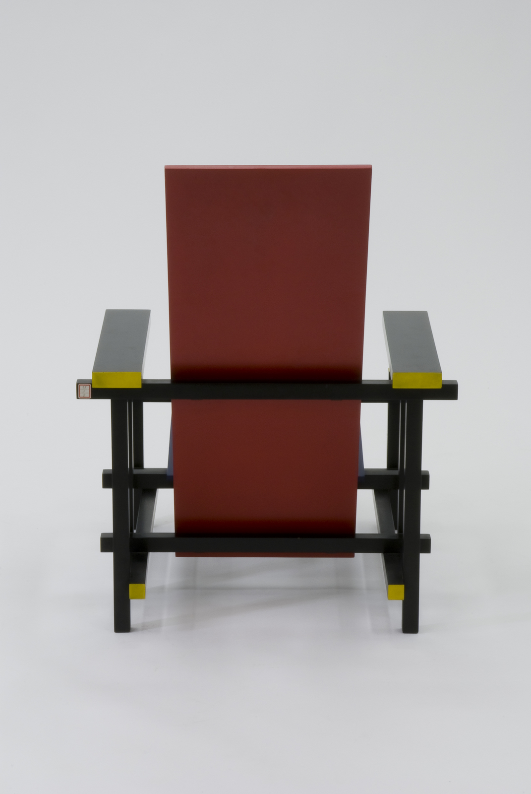 リートフェルトはオランダの新しい造形運動デ・スティルのリーダーの一人であった。一つのモデュールの部材で組み合わせていくという造形論理に基づいてつくられたのがこの椅子である。あたかもモンドリアンの平面(絵画)をリートフェルトが立体(椅子)に置き換えたような構造である。事実この椅子の構造は、フレームとアームの構成に二種類の角材を使い、組み立ての間隔はその断面の倍数でとり、また角材の断面には黄色が塗られており、背と座面は赤と青で塗装して構成してある。それがこの椅子の名前の由来でもある。この大胆な色彩と構成は画家と行動をともにしてきたからとも考えられる。