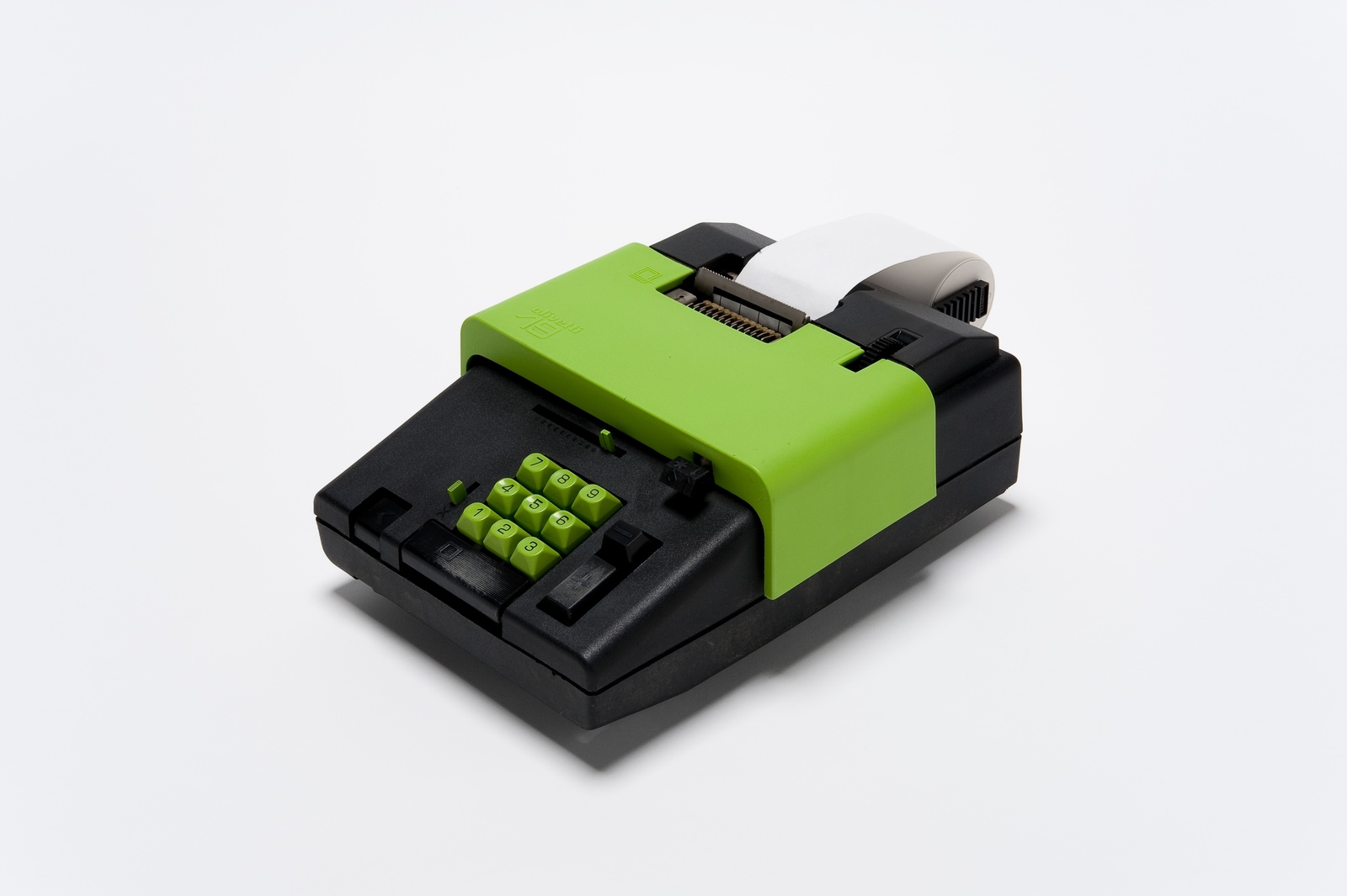 タイプライターに続き、オリベッティ社は計算機と加算機の製造に着手した。後年になるとオリベッティ社はコンピューターなど情報処理機器の製造が主力事業となるが、その根幹にあるのが計算機や加算機である。タイプライターの開発で蓄積された技術を活用し、高い性能と美しさを兼ね備えた製品を次々と発表した。機械による印字と計算という分野で、オリベッティ社は他の追随を許さず、企業として大きく発展を遂げることになる。 まるでおもちゃのような外観の加算器「スンマ19」はボディがすべてプラスチックで作られているため非常に軽く、低価格での販売も可能となった。機構部を覆う黄緑色のカバーと黒地のボディのコントラストが鮮烈な印象を与え、伊坂芳太郎がデザインしたポスターにもそのカラーリングに驚く人々の様子が描かれている。 |
