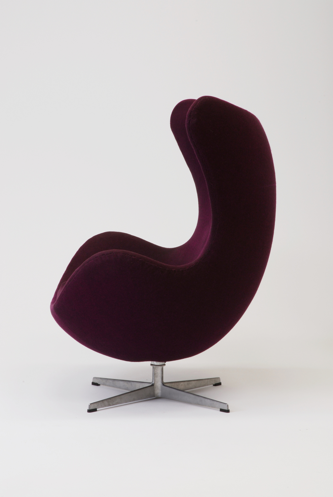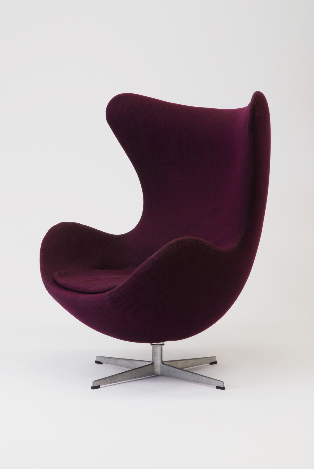 後方から見たシルエットから、エッグ(卵)の名がつけられた。ホテルのロビー用につくられた椅子であり、1つのテーブルを囲んで、他の人たちとは隔離された空間をつくるために考えられた形である。つまりハイバックにし、体を囲むことがコンセプトである。ロビーだけでなく他の空間でも使用され、量産できるように硬質発砲樹脂が使われている。この椅子はゆったりしており、背に寄り掛かるとリクライニングするが、4本脚でも十分安定している。この椅子は新しい素材と、新しい製法でつくられているため発売当初は奇抜な存在だった。 |
