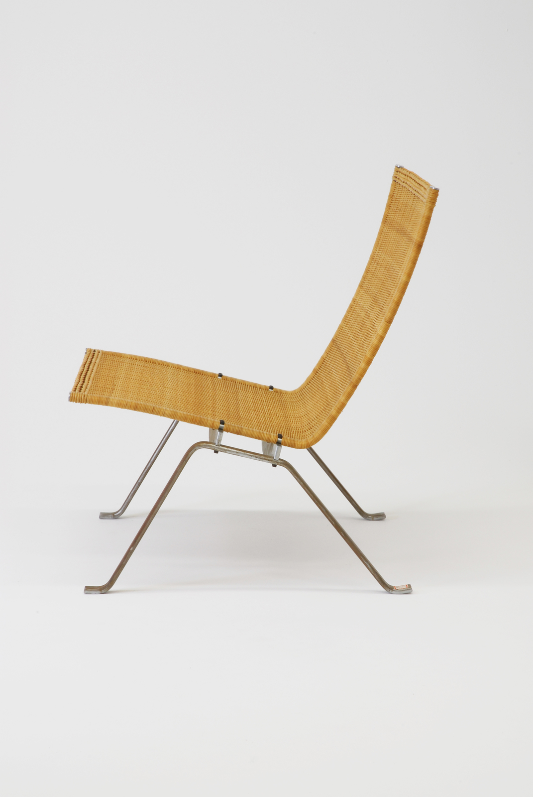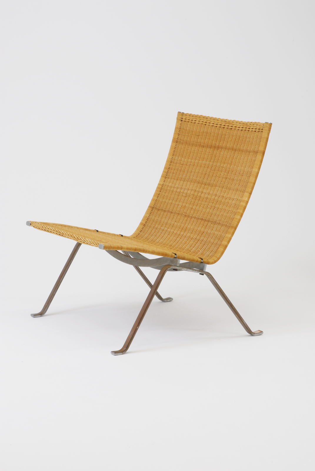 ミース・ファンデル・ローエの持っている格調、気品を尊敬していたケアホルムは、良質な人工の素材と自然の素材との調和で豊かなものをつくろうと考えた。この椅子は籐で一体となった背および座の部分と、金属でできた脚の部分との対比で出来ている。しかもデンマークの木製家具の中にある質素でありながら構造が明解でありディティールが美しいという3つの伝統はしっかり引き継いでいる。この椅子のプロデューサーであるコール・クリスティエンセンは通常、鉄では出来ないこの構造に苦労した末、生産を実現したのである。一つデザイナーと技術を持つ者との信頼関係でできたすばらしい事例によって生れた椅子である。 |