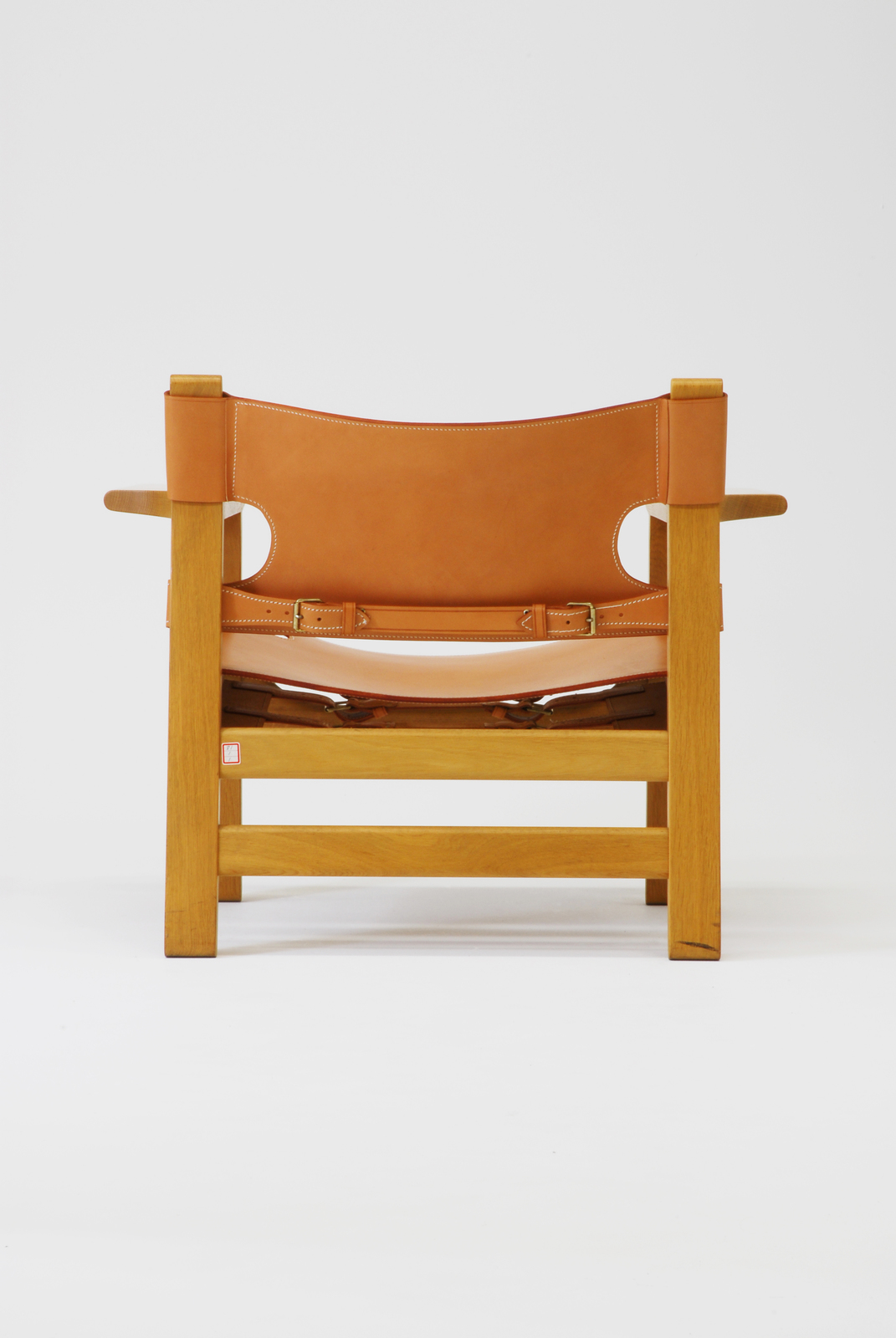 モーエンセンが「F.D.B」からフリーになったあとにつくった椅子である。背と座がそれぞれ厚い一枚革でつくられたスペインの椅子をリデザインしたものである。リデザインをするときに大切なことがらは2つあり、1つは今日の技術を用いつつ品質を落とさないこと。2つ目は今日の生活にあわせて機能的に使いやすくすることである。モーエンセンは2つのことを忘れずにリデザインしている人物であるといえるだろう。アームは小テーブルとして使うことができ、また革は伸びてもベルトで調節できるようになっている。 |
