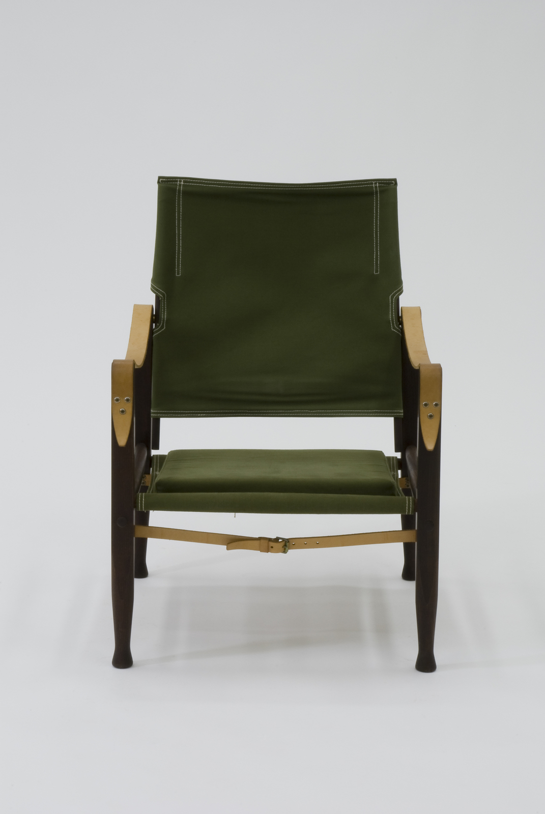 植民地に派遣されたイギリスの将校が使用した携帯、組立に簡便な椅子をヒントにして、コーア・クリントがリ・デザインしたものである。彼はデンマークの視点から見たイギリスの伝統を大切にし、なおかつ機能性も重視していた。リ・デザインされた「サファリ」も分解して運びやすくなっている。背と座は布張りと革張りの2種類で、アーム部分は革、脚はチーク、アッシュでできており、すべて分解したあと一つにまとめられて片手で軽く持てるほどに小さくなる。全体を軽くするために構造はとても単純である。接地面がたいらでなくてもそれなりに安定する軟らかい構造となっている。 |