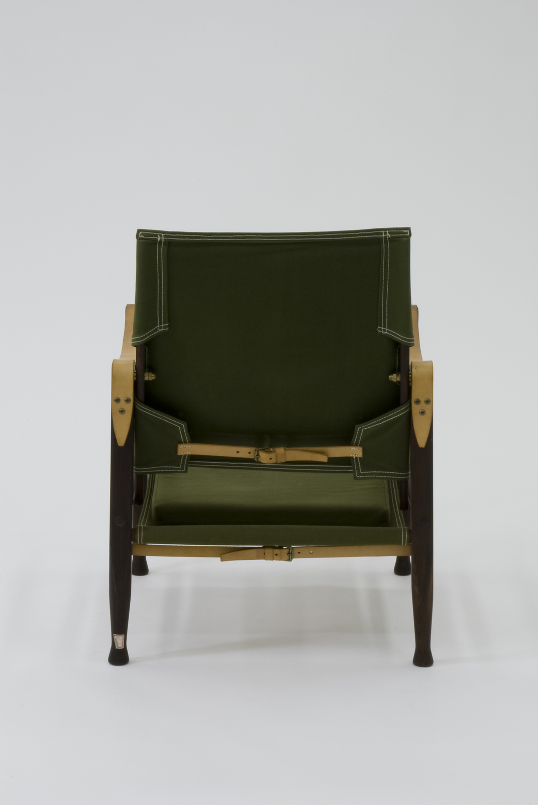植民地に派遣されたイギリスの将校が使用した携帯、組立に簡便な椅子をヒントにして、コーア・クリントがリ・デザインしたものである。彼はデンマークの視点から見たイギリスの伝統を大切にし、なおかつ機能性も重視していた。リ・デザインされた「サファリ」も分解して運びやすくなっている。背と座は布張りと革張りの2種類で、アーム部分は革、脚はチーク、アッシュでできており、すべて分解したあと一つにまとめられて片手で軽く持てるほどに小さくなる。全体を軽くするために構造はとても単純である。接地面がたいらでなくてもそれなりに安定する軟らかい構造となっている。 |