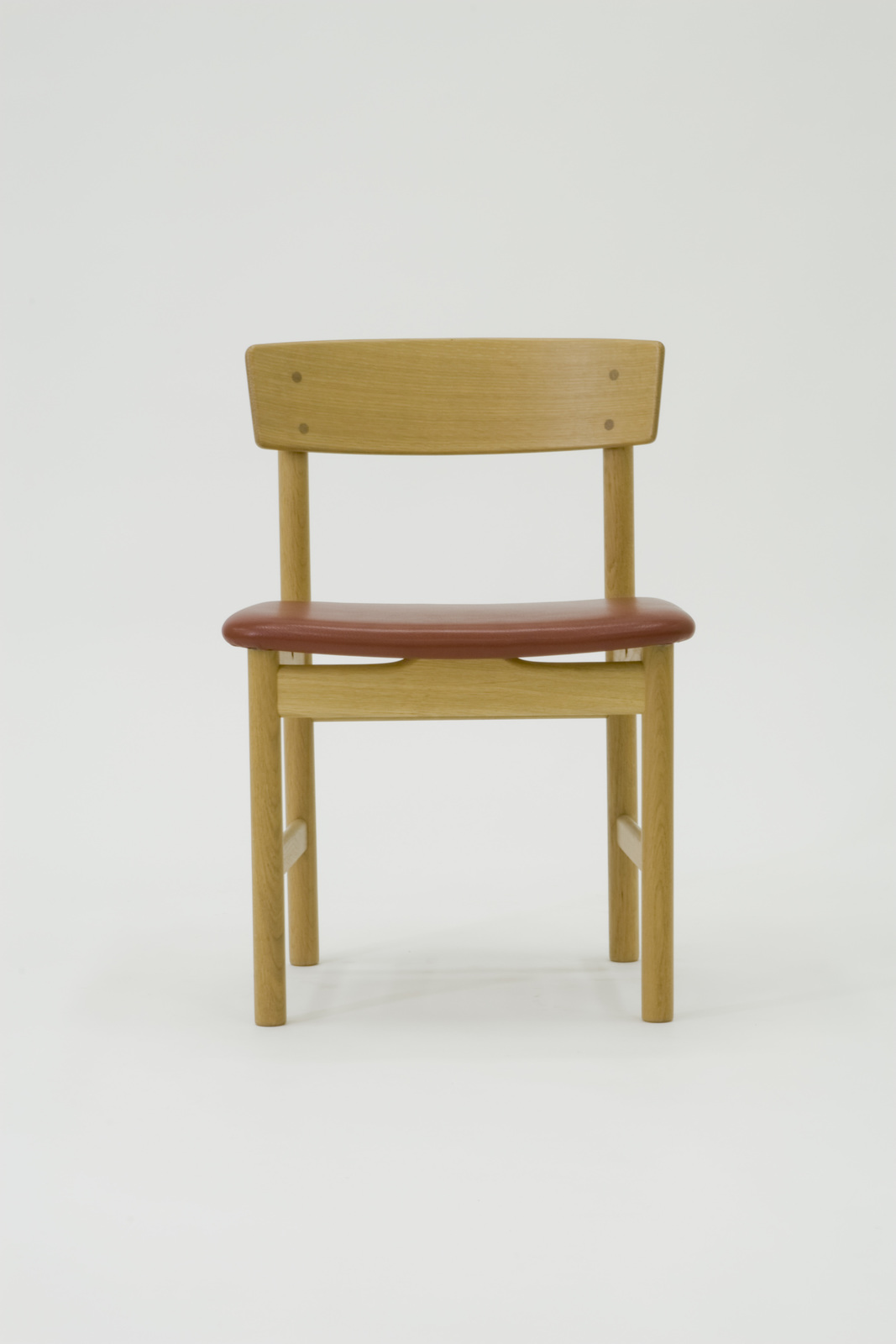 この椅子の原形はモーエンセンが1947年にデンマーク協同組合の家具部門「F.D.B」でデザインした「J39 シェーカーチェア」である。「F.D.B」からフリーになったのち、1956年に彼は「J39」の座を革張りにリデザインしてこの椅子をつくった。背の造形に対して座を革張りのフラットな面につくりあげたところに調和が見られる。この頃からモーエンセンは積極的に革を使いはじめ、スパニッシュチェアなど革とオークを様々な家具で組み合わせて用いている。この椅子は1956年以来今日まで生産されており、デンマークの庶民に永く支持され続けている。 |