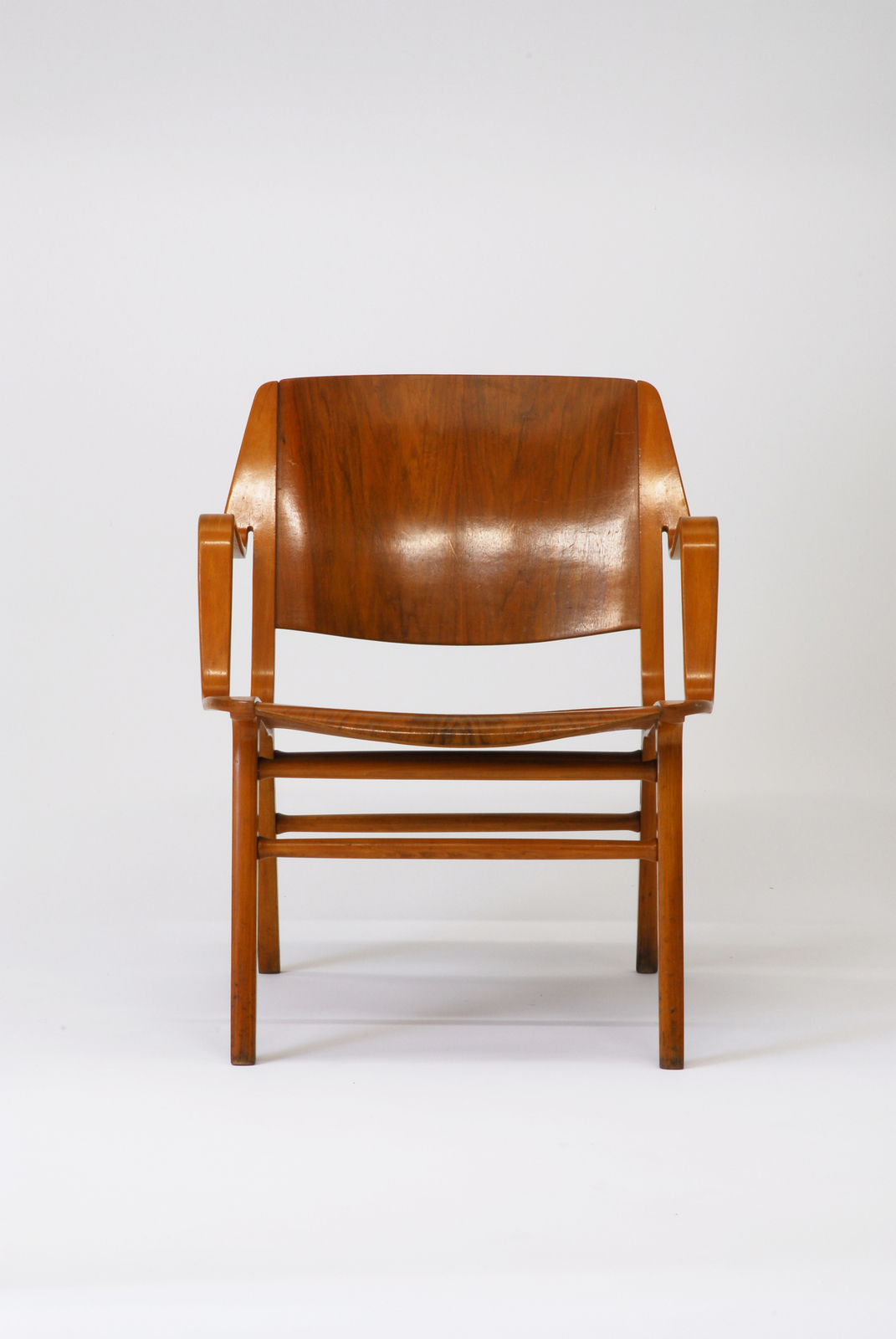 成型合板の椅子としては、きわめて初期ににできたものである。すべてが単純な成型合板でできているように見えるが、それは背と座だけで、他の部分は色々なアイデアによってつくられた椅子である。この椅子はノックダウン(組立式)になっており、脚にナットがインサートされており、貫は逆ネジになっている。座と背を左右の脚フレームで挟みながら4本の貫を回転させて組み立てる仕組になっている。脚は駒を入れて成形する駒入れ成形(ラケット構造)になっている。成型合板によって新しい技術と構造を生み出した椅子である。 |