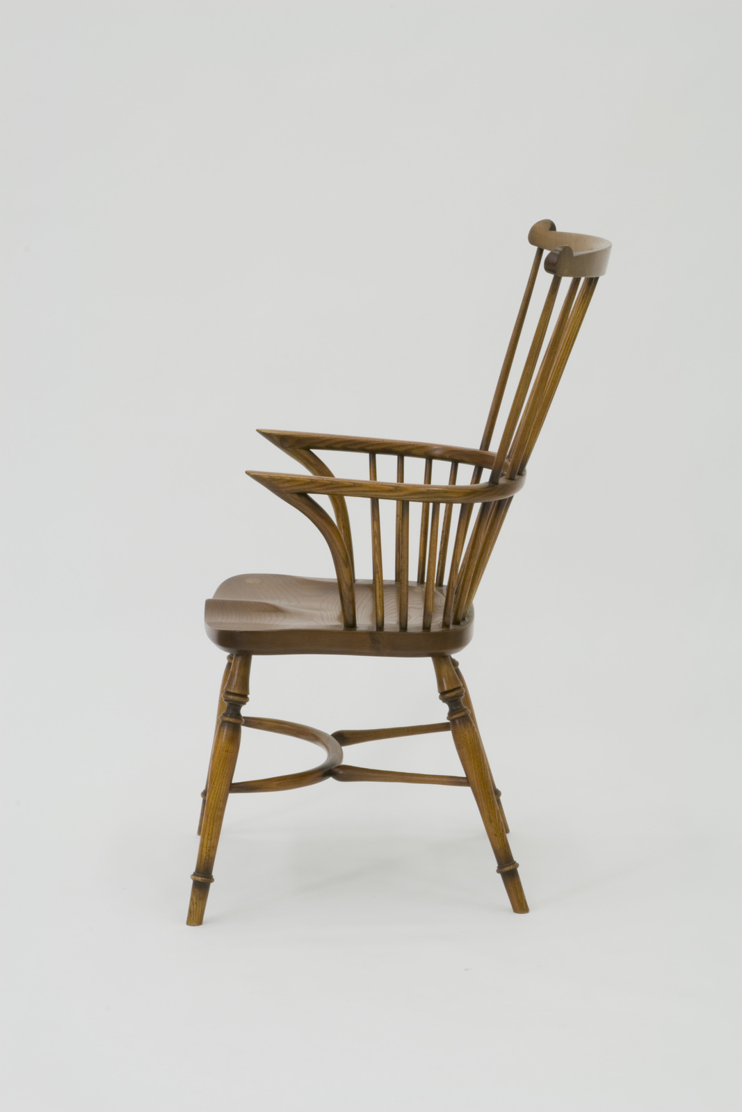 イギリスの各地で農民達の手によって実用性を重んじてつくられていた椅子が、17世紀後半頃にウィンザーチェアとしてひとつの完成の域に達した。そのなかでも最も古いタイプのひとつが、このコム(櫛)バックである。細いスポークが平行して並ぶ造形は、座り心地の良さの象徴である。またニレ材を用いた座板も座り心地の良さを求めて、波型の削りだしとなっている。なお「貫」の部分に使われているカウホーンと呼ばれる形は、ウィンザーチェアが様式家具から影響を受けた一つの典型例であろう。 |